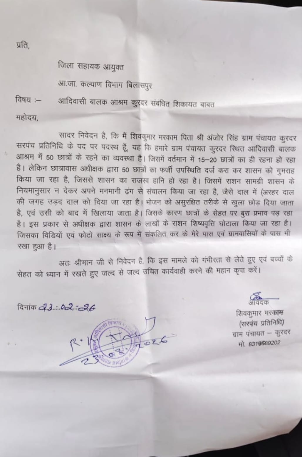 बिलासपुर । जिले के आदिवासी क्षेत्र में संचालित आदिवासी बालक आश्रम कुरदर एक बार फिर विवादों में आ गया है। आश्रम के अधीक्षक पर बच्चों की फर्जी उपस्थिति दर्ज कर शासन से मिलने वाली राशि और राशन के दुरुपयोग का गंभीर आरोप लगा है। ग्रामीणों और शिकायतकर्ता ने पूरे मामले की निष्पक्ष जांच कर कार्रवाई की मांग की है।