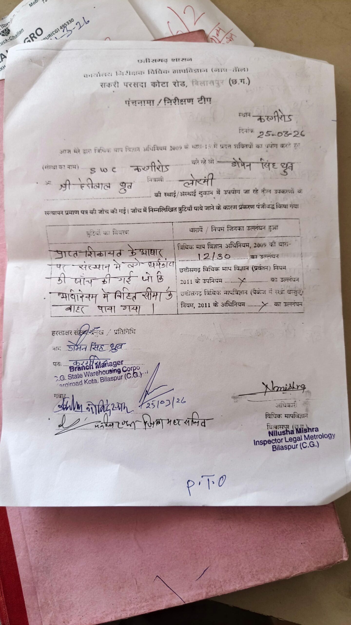 कोटा-बिलासपुर, विकासखंड कोटा के वेयरहाउस में स्थापित धर्मकांटा में बड़ी गड़बड़ी सामने आई है। जांच में पुष्टि हुई है कि राशन की तौल में कमी की जा रही थी, जिससे उचित मूल्य दुकानों को प्रतिमाह कम सामग्री मिल रही थी।