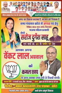 कोटा नगर पंचायत वार्ड 9 में बीजेपी पार्षद प्रत्याशी वेंकट लाल अग्रवाल का जनसंपर्क जारी, जनता का मिल रहा समर्थन।