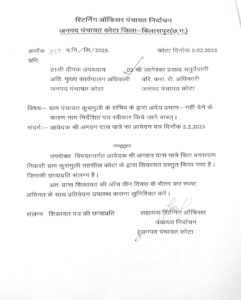कोटा। जनपद पंचायत कोटा के अंतर्गत ग्राम पंचायत कुसमुली में सरपंच पद के प्रत्याशी अघन दास पात्रे ने सचिव पर गंभीर आरोप लगाते हुए नामांकन प्रक्रिया में लापरवाही का मामला उजागर किया है।