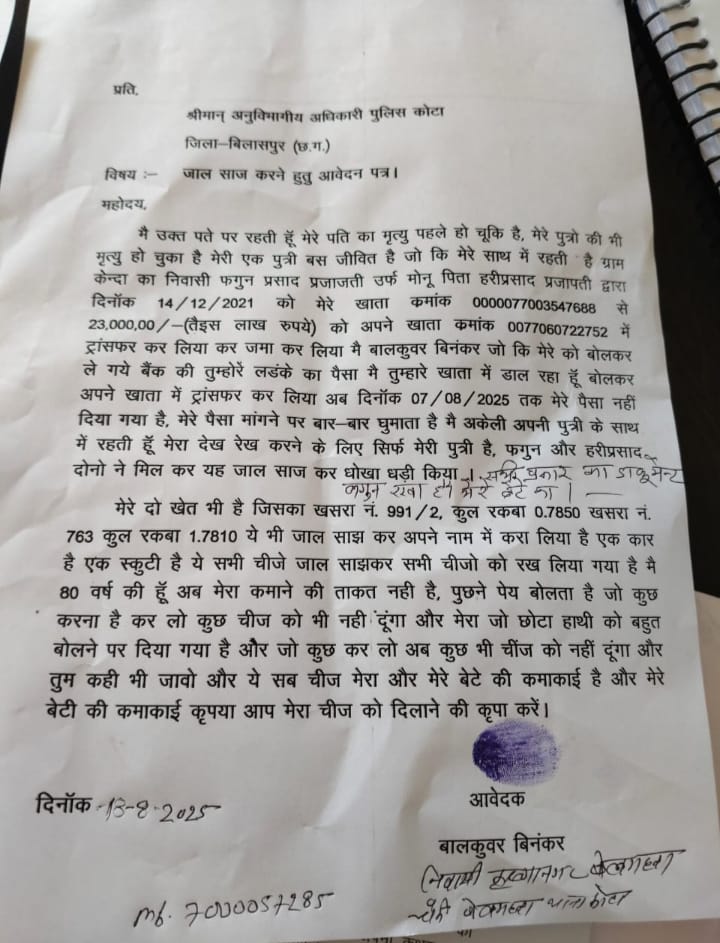 बिलासपुर। बेलगहना चौकी क्षेत्र की 80 वर्षीय विधवा महिला बालकुवर बिनंकर ने अपनी जमीन, जेवर और 23 लाख रुपये हड़पने का गंभीर आरोप लगाया है। पीड़िता ने ग्राम केन्दा निवासी फगुन प्रसाद प्रजापति उर्फ मोनू और उसके पिता हरीप्रसाद प्रजापति पर धोखाधड़ी करने तथा दबाव बनाने की शिकायत दर्ज कराई है।