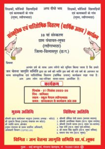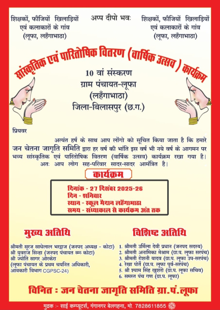 बिलासपुर।जिला बिलासपुर के ग्राम पंचायत लूफा (लहंगाभाटा) में सामाजिक जागरूकता और सांस्कृतिक विरासत को बढ़ावा देने के उद्देश्य से जन चेतना जागृति समिति द्वारा सांस्कृतिक एवं पारितोषिक वितरण (वार्षिक उत्सव) कार्यक्रम का भव्य आयोजन किया जा रहा है। यह कार्यक्रम समिति द्वारा लगातार दसवें वर्ष आयोजित किया जा रहा है, जिससे ग्रामीणों में विशेष उत्साह और उमंग देखने को मिल रही है।
