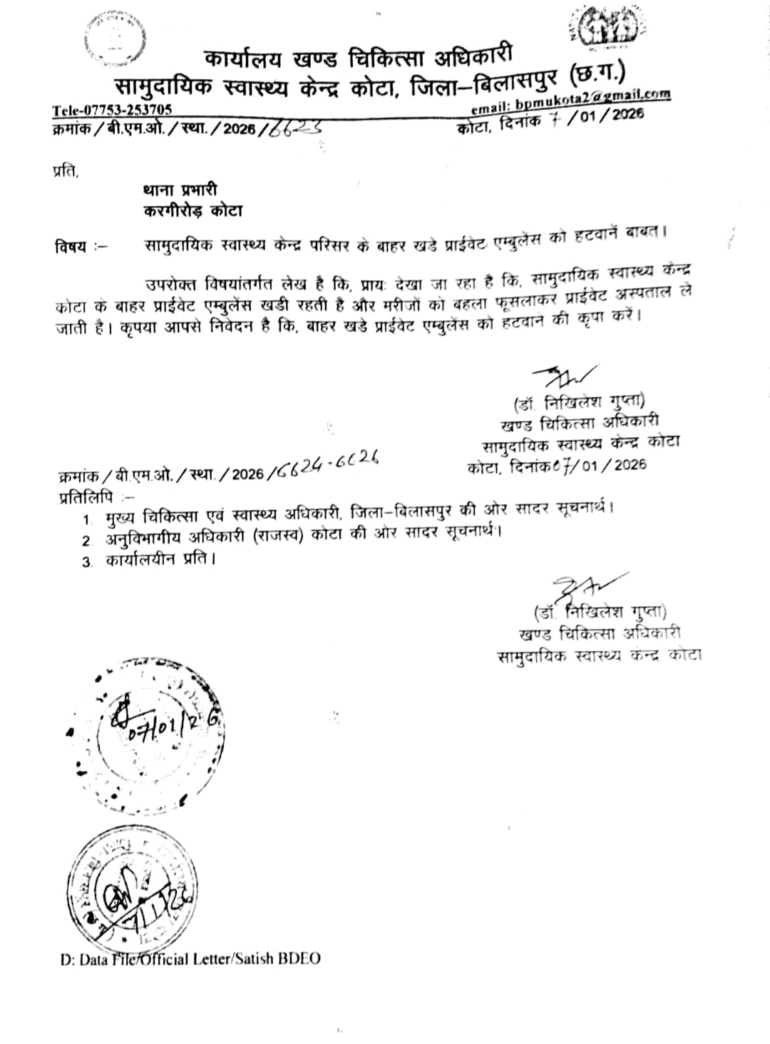 मामले की गंभीरता को देखते हुए खण्ड चिकित्सा अधिकारी, सामुदायिक स्वास्थ्य केंद्र कोटा डॉ. निखिलेश गुप्ता ने सख्त रुख अपनाया है। उन्होंने स्पष्ट निर्देश जारी करते हुए कहा है कि कोटा स्वास्थ्य केंद्र से रिफर किए जाने वाले सभी मरीजों को केवल शासकीय वाहन से ही शासकीय अस्पताल भेजा जाएगा। यदि किसी अधिकारी या कर्मचारी की संलिप्तता पाई जाती है या मरीज को प्राइवेट एंबुलेंस अथवा निजी अस्पताल भेजा जाता है, तो संबंधित के खिलाफ कड़ी कार्रवाई की जाएगी।इतना ही नहीं, प्राइवेट एंबुलेंस की दबंगई को लेकर कोटा थाना में भी शिकायत दर्ज कराई गई है। थाना प्रभारी से अस्पताल परिसर के बाहर खड़ी प्राइवेट एंबुलेंस को तत्काल हटवाने का अनुरोध किया गया है।